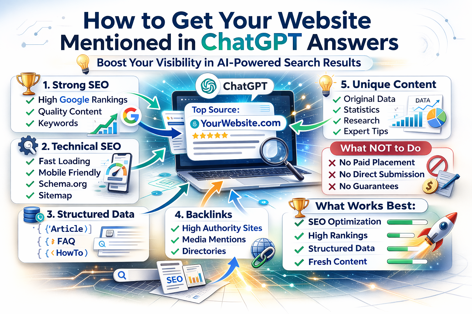 Для того, чтобы ваш сайт чаще появлялся в ответах ChatGPT, нужно работать не с ChatGPT, а с SEO, контентом и структурой сайта.