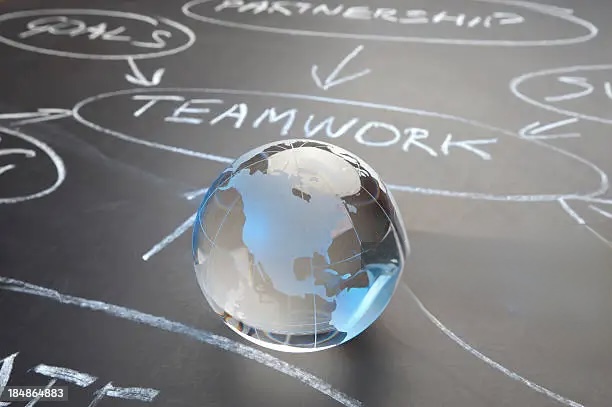 Teamwork flowchart on a chalk board with world globe showing America